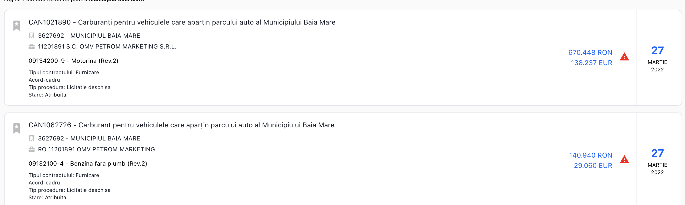 Pentru 6 luni de salubritate stradală (contractele au fost semnate în 3 martie 2022, deci perioada contractată este martie-august 2022), Primăria Baia Mare va plăti aproape 6,8 milioane de lei (exact: 6.775.099,54, sumă care include TVA), adică o medie de 1,13 milioane de lei/lună.