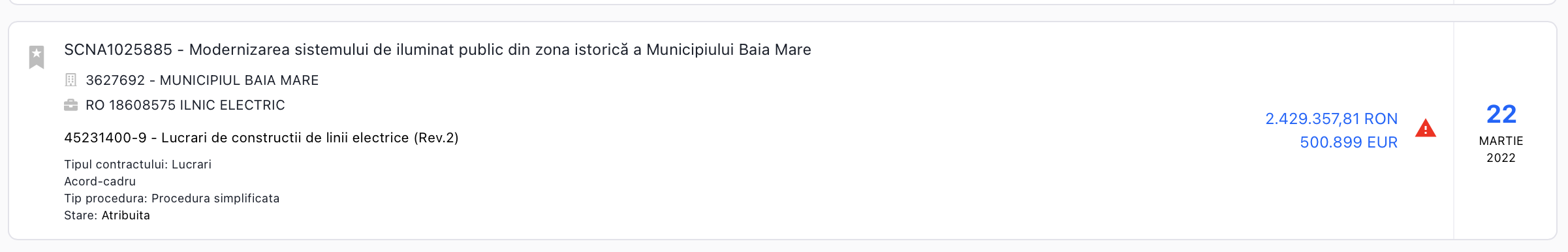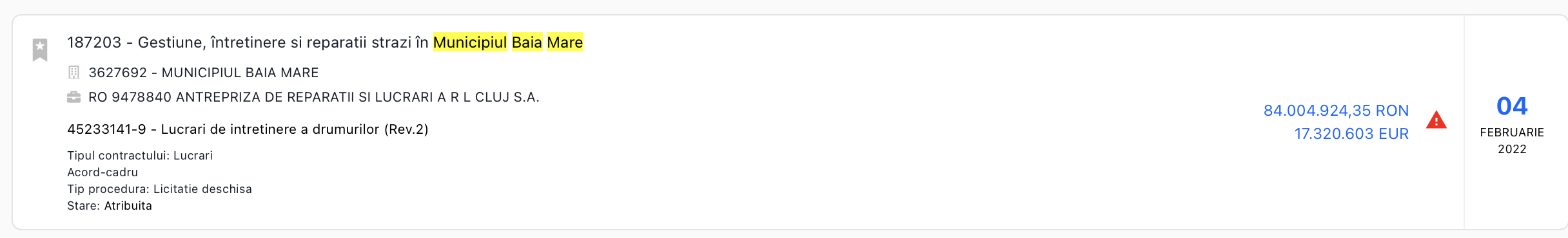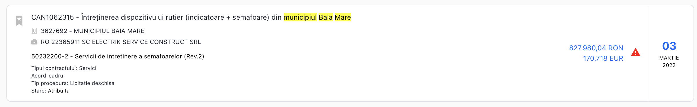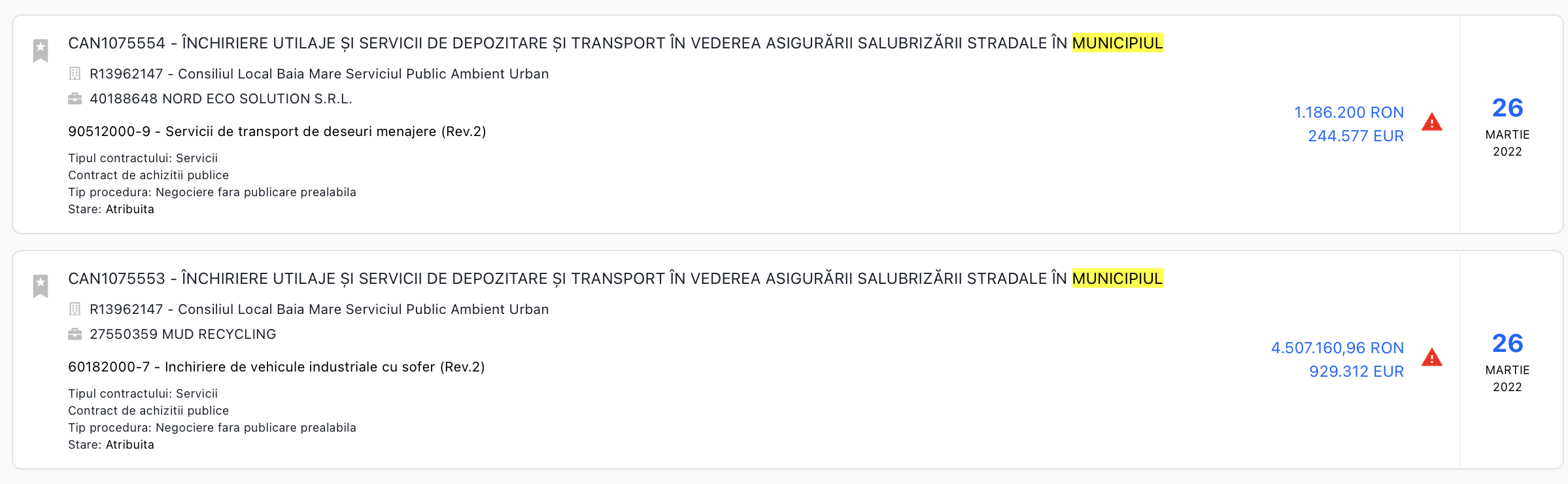 Asa cum nota un jurnalist băimarean, Cătălin Vischi, contractul a fost atribuit pe o perioadă de 6 luni, prin procedura “fără publicarea prealabilă a unei invitații la procedura concurențială de ofertare in Jurnalul Oficial al Uniunii Europene” (adică prin negociere directă), fapt motivat de autoritatea publică prin „extremă urgență determinată de evenimente care nu puteau fi prevăzute de către autoritatea contractantă”. Motivarea este falsă, contractul pentru salubritate stradală fiind finalizat la termen, în 1 decembrie 2021, dată la care pe rolul sistemului de licitații publice era în derulare o licitație publică, anulată ulterior de Primăria Baia Mare.