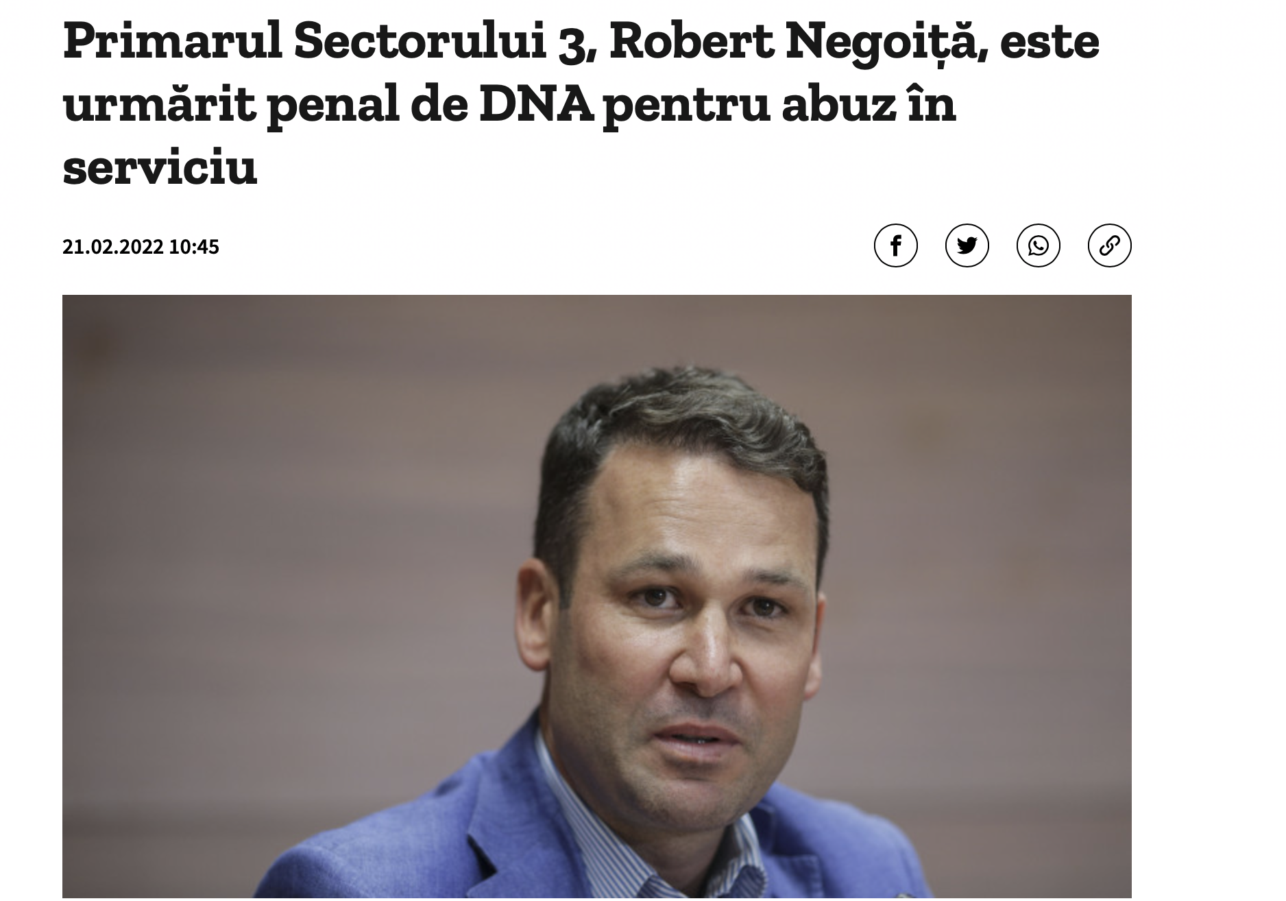 Primarul Sectorului 3 Robert Negoiță este cercetat de DNA pentru abuz în serviciu, alături de șase foști și actuali șefi din administrația locală, pentru un prejudiciu uriaș, de peste jumătate de miliard de lei. Acuzațiile sunt legate de prelungirea contractului de salubrizare.