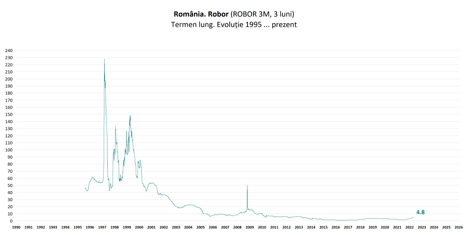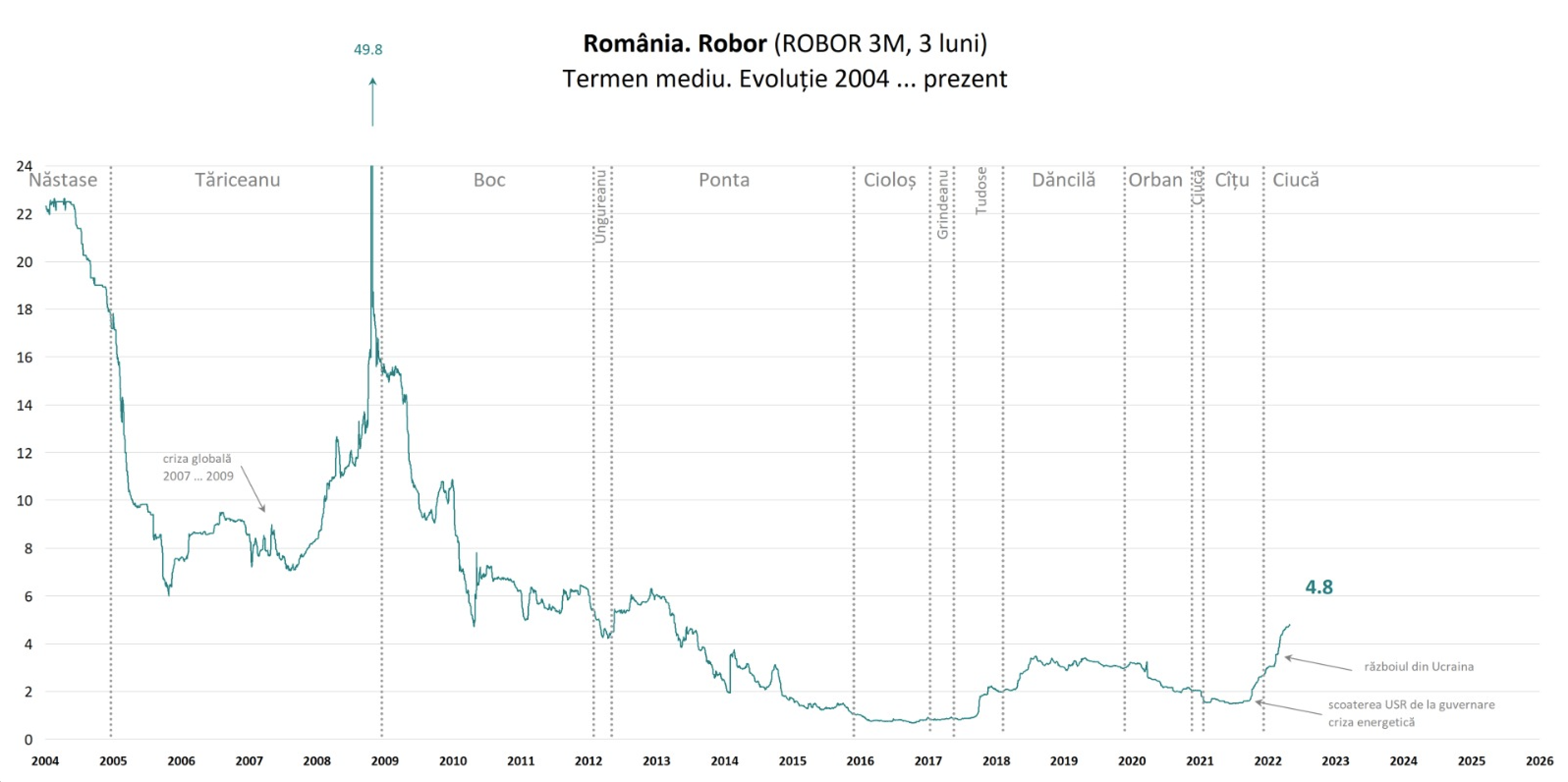 Pe urmă criza energetică se intensifică. Între timp Cîțu cade de la guvernare, e înlocuit de Ciucă. Se face deja 2022, vine războiul din Ucraina. Ce să vezi, Roborul saltă de la 3% la peste 4.5%. Acuma cel mai recent e deja 4.8%.