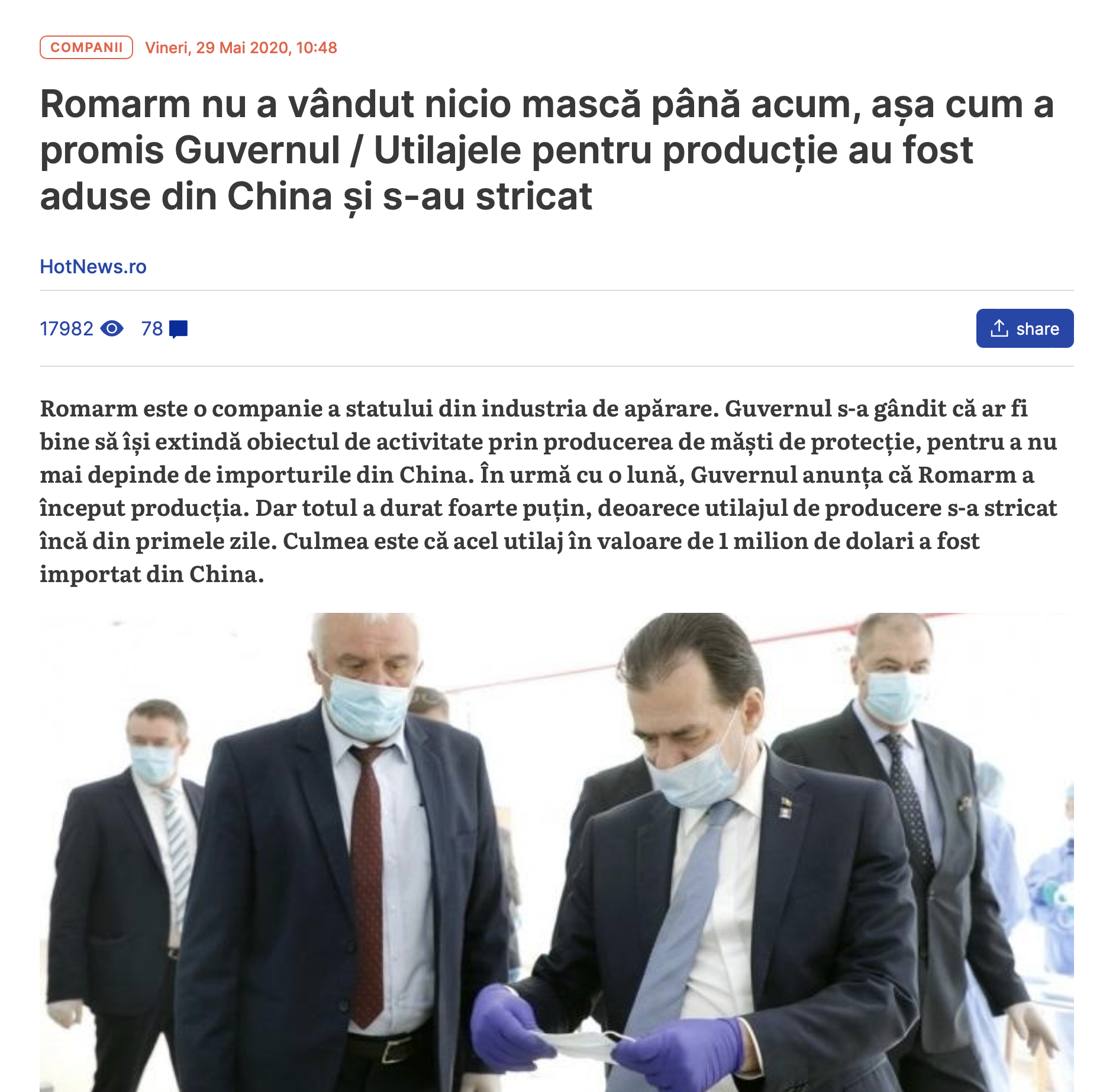 Arsenal Reşiţa, Fabrica de Pulberi Făgăraş, Uzina de Produse Speciale Dragomireşti, Uzina Mecanică Sadu, Uzina Mecanică Plopeni – toate aceste filiale lucrează pe linii de producţie uzate moral şi tehnologic şi produc minus valoare. Suntem atât de înapoiaţi încât, nici măcar în pandemie, Romarm nu a putut susţine preoducţia românească de măşti de protecţie. Când i s-a cerut Romarm să ajute România cu măşti de protecţie, compania era total nepregătită, ba chiar a livrat măşti neconforme. Livrarea de măşti a ajuns apoi pe mâna interlopilor, intereselor de grup ale personajelor care au gestionat pandemia.