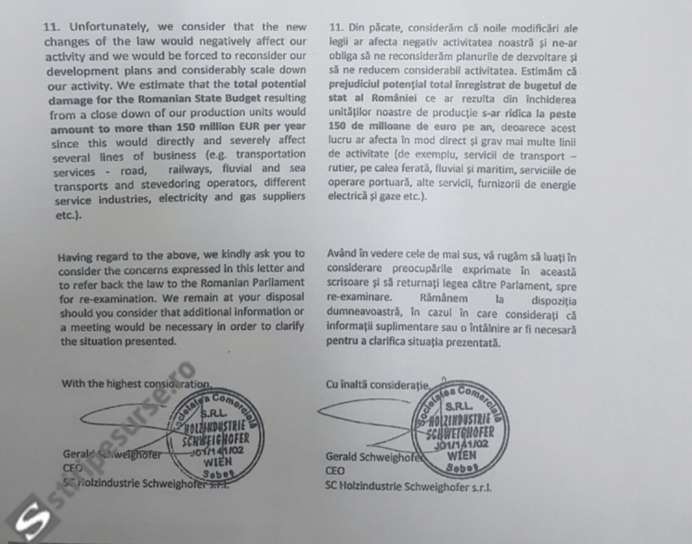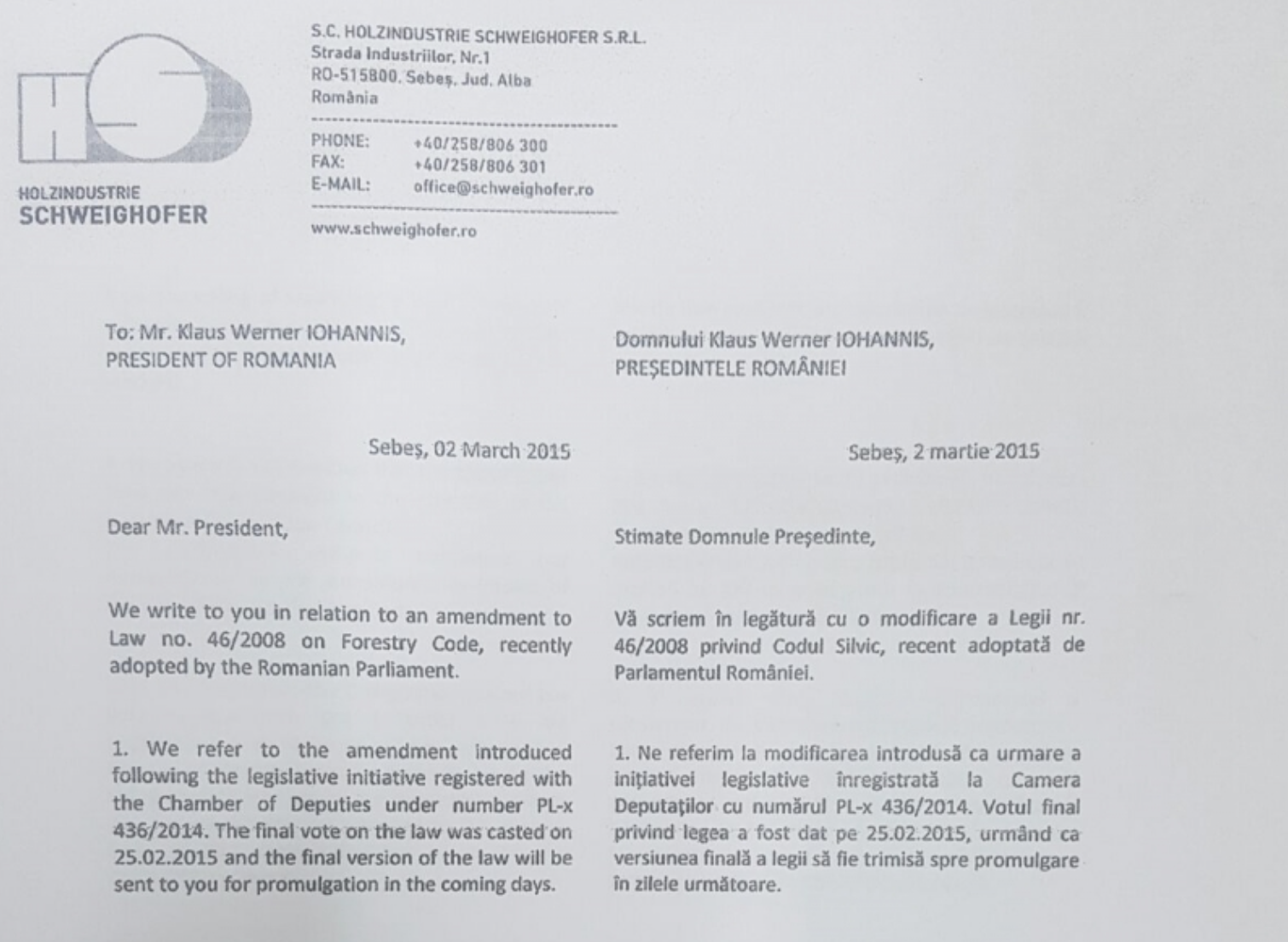 ”Am obtinut un document care să vă facă să înțelegeți cine și cum protejeaza această mafie a pădurilor de la vârful statului român. E o scrisoare a lui Schweighofer către președintele României, Klaus Iohannis, datată 2 martie 2015. Parlamentul a trimis la promulgat către Klaus Iohannis legea pădurilor astfel încât pădurile României să fie protejate și salvate. Pe 2 martie 2015, abia ajunsese președinte Klaus Iohannis și a primit o scrisoare prin intermediul finului său, Andreas Huber, consulul onorific al Austriei de la Sibiu. Această scrisoare l-a făcut pe Klaus Iohannis să întoarcă în Parlament legea care ar fi salvat pădurile României. Este dovada clară că străinii, astăzi, au atâta putere și influență, încât reușesc să manevreze până și președintele României.