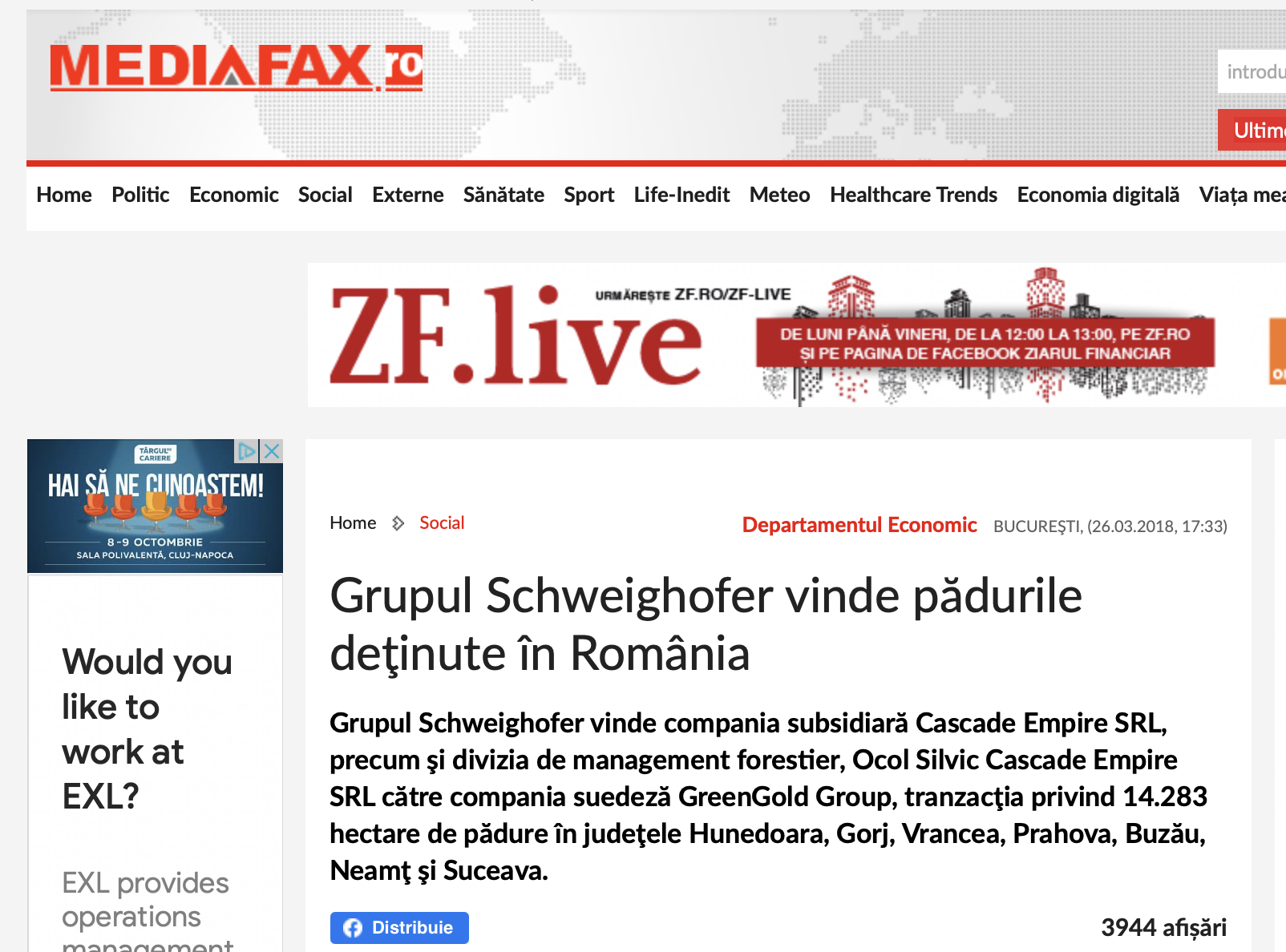 Sub presiunea constanta a opiniei publice si a societatii civile, firma Schweighoffer face si ea un pas interesant in 2018, și anunță că a vândut două subsidiare din grup, care dețineau în proprietate 15.000 de ha de pădure în România, unei companii pe nume... ati ghicit, Greengold, la un preț care nu a fost anunțat public.