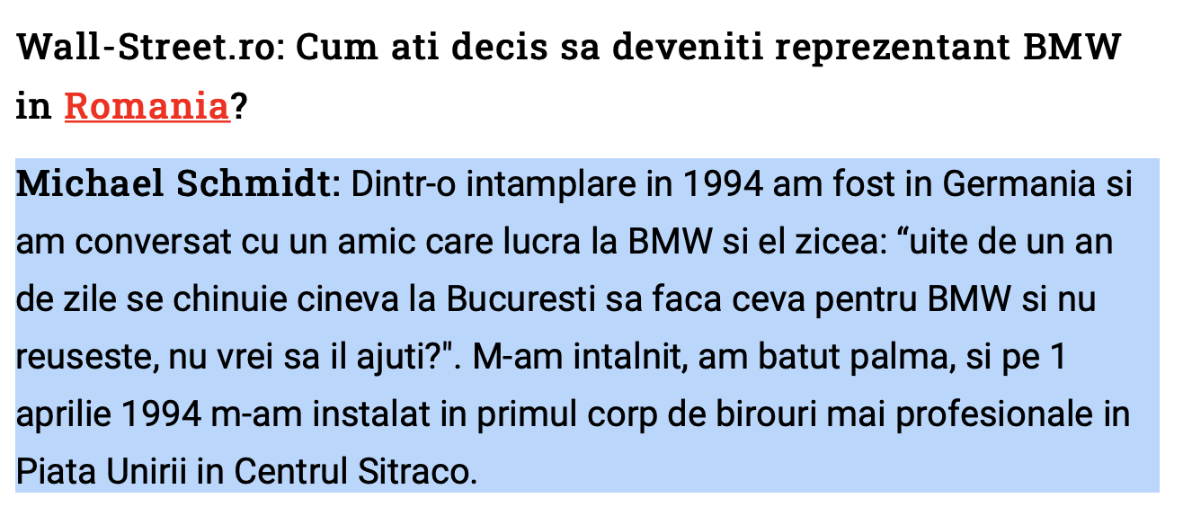 Influența BND asupra lui Schmidt nu a încetat în 1990. Germania, prin serviciul de spionaj BND, îi face lui Michael Schmidt rost și de o acoperire lucrativă: la nici 34 de ani, așa, tam-nisam, poc!, tânărul Michael Schmidt primește de la BMW dreptul de a vinde marca în România în calitate de dealer național. Vă dați seama ce "noroc" pe mucosul de Schmidt, să aibă în 1994 așa o "viziune" de business?