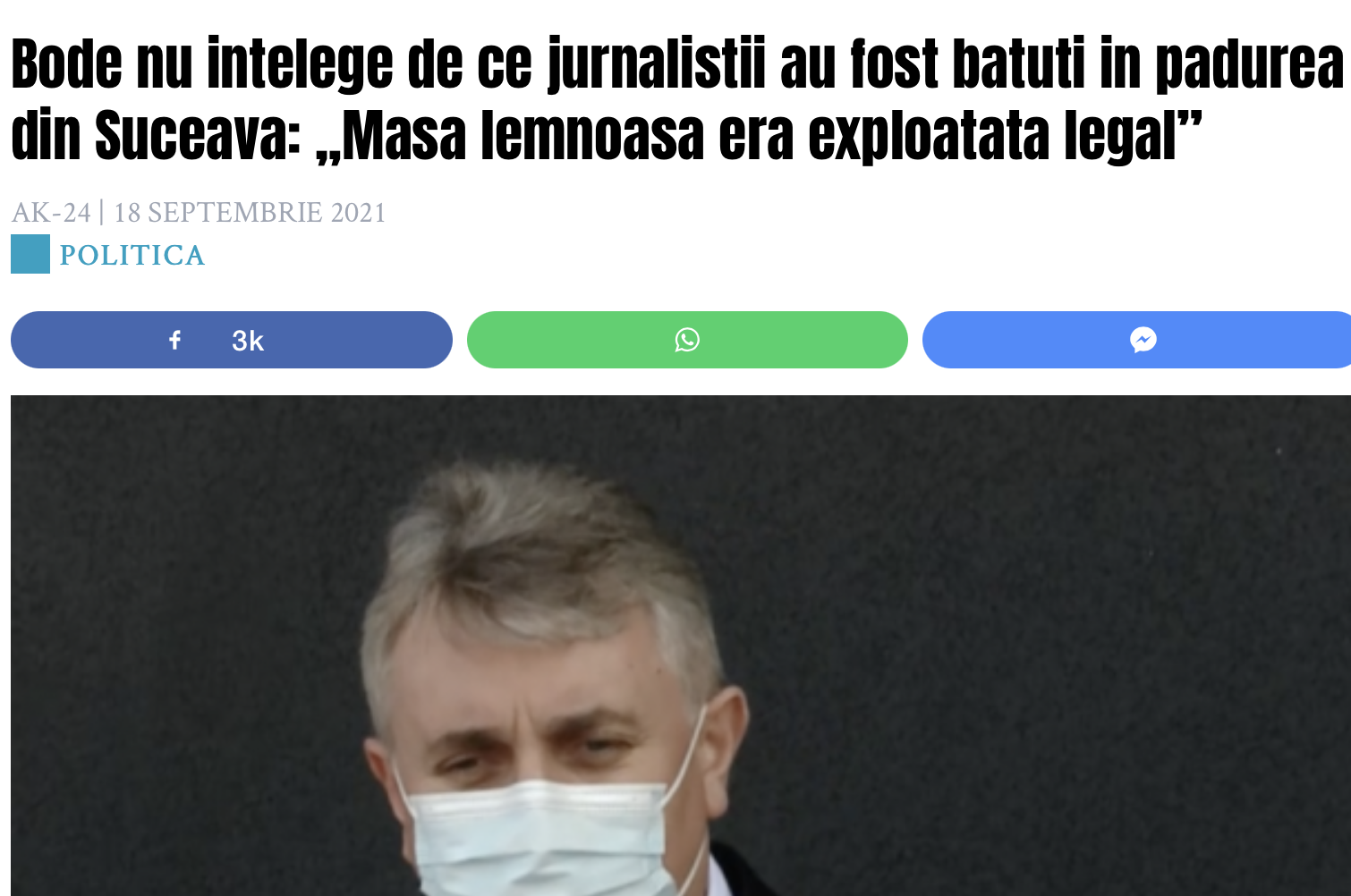 Dar nu despre ziariștii bătuți vreau să vorbim azi, ci despre felul în care, în mod miraculos Lucian Bode a dat cea mai ciudată și neinspirată declarație vizavi de bătaia jurnaliștilor, spunând că cei care exploatau pădurea acționau, în fapt, legal. Bode face pe prostul. Jurnalistii investigau taierile ilegale facute PESTE documentele de exploatare legala. Fiindca asta e confuzia din capul opiniei publice si v-o lamuresc eu: mafia lemnului se acopera mereu de acte, de autorizatii, dar exploateaza infinit mai mult lemn decat prevad cotele sau documentele. Lemnul la negru vandut la negru e miza adevarata.