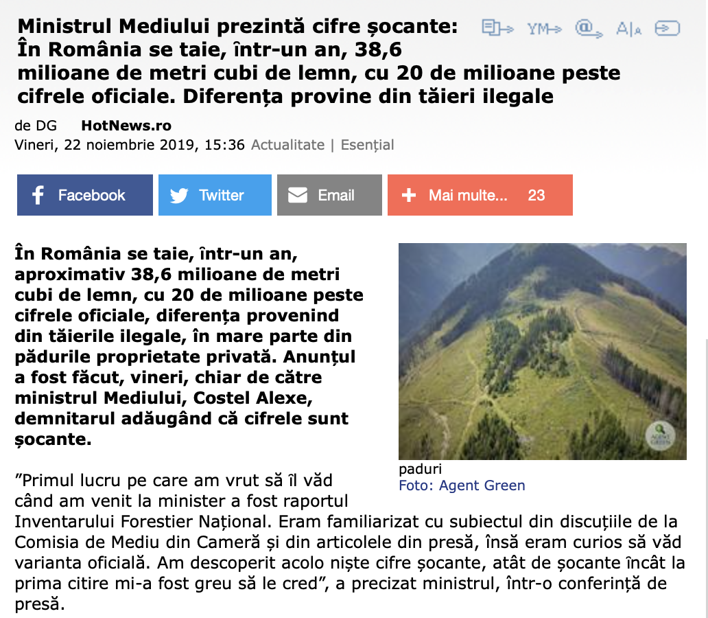 ”Diferența de la 18,5 milioane de metri cubi la 38,6 milioane metri cubi reprezintă tăieri neautorizate. Astăzi, cele mai mari probleme de tăieri neautorizate le avem în pădurile proprietate privată, apoi în pădurile autorităților publice locale și, pe locul trei, în pădurile administrate de RNP Romsilva” a arătat ministrul Alexe.