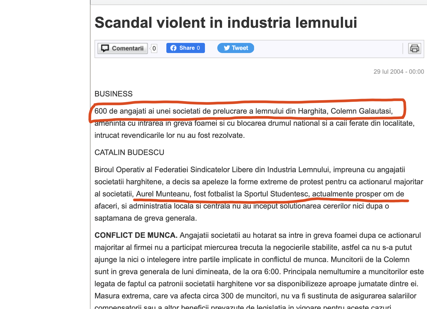 In 29 iulie 2004, izbucnea un conflict de munca violent in industria lemnului: 600 de angajati amarati luau jet de la milionarul Aurel Munteanu, proprietarul unei firme de prelucrare a lemnului din Harghita: