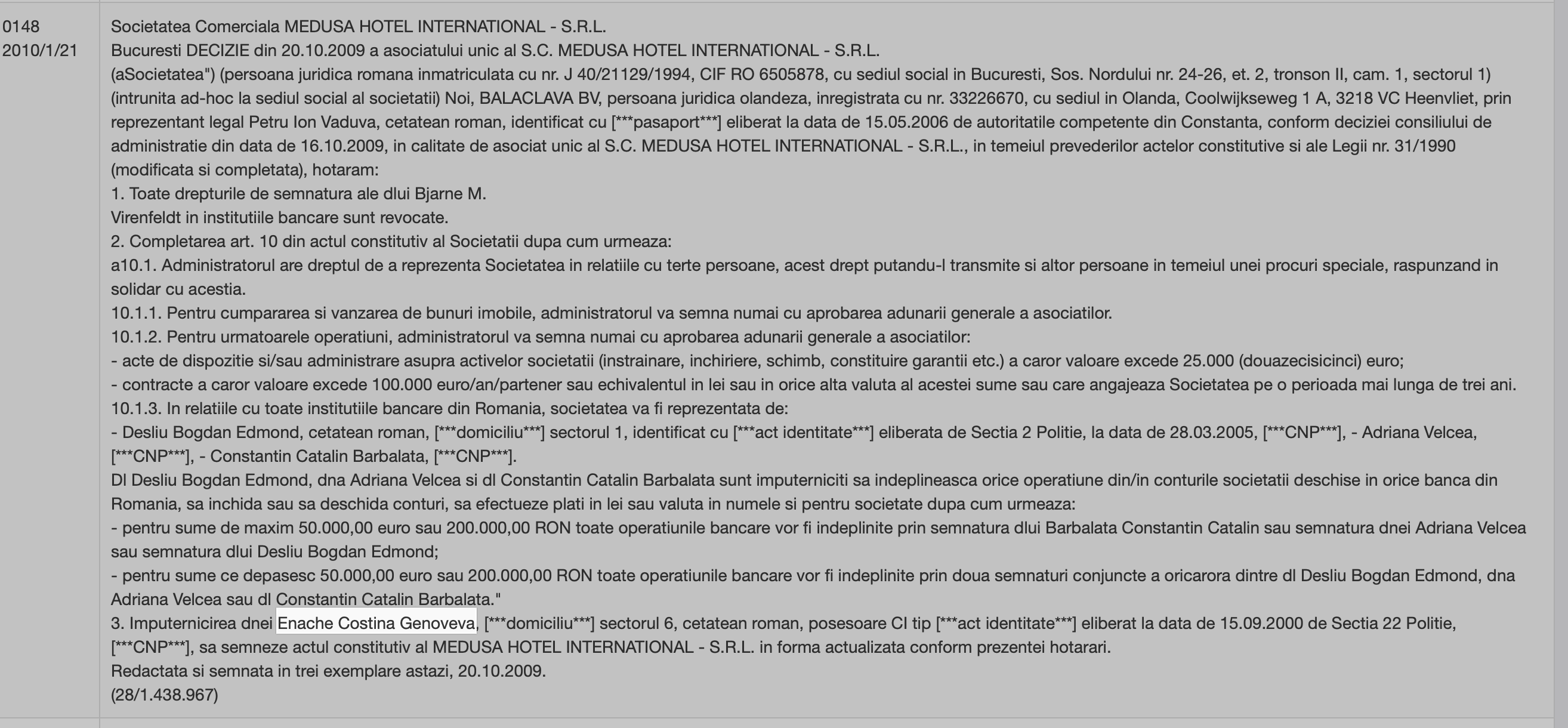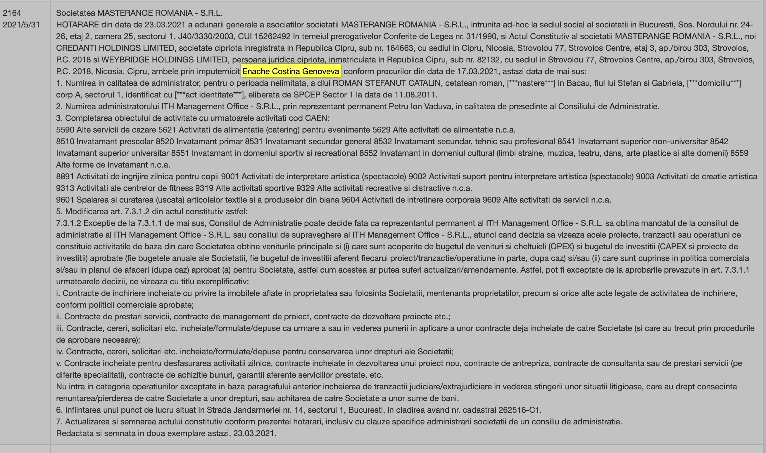 ... si alta mai prospetica ce ne arata ca exact acum 5 luni, Enache Costina Genoveva era mentionata ca mandatar al unui off-shore din cadrul firmei Masterange Romania SRL, societate comerciala care este "pe fata" proprietara complexului Stejarii. Pai, tovarasi, numai si pentru asa ceva ar fi meritat ca Tiriac sa fie adus atunci la DNA pentru explicatii. De fapt, ar merita chiar si azi, in 2021, ca nu e nimic prescris.