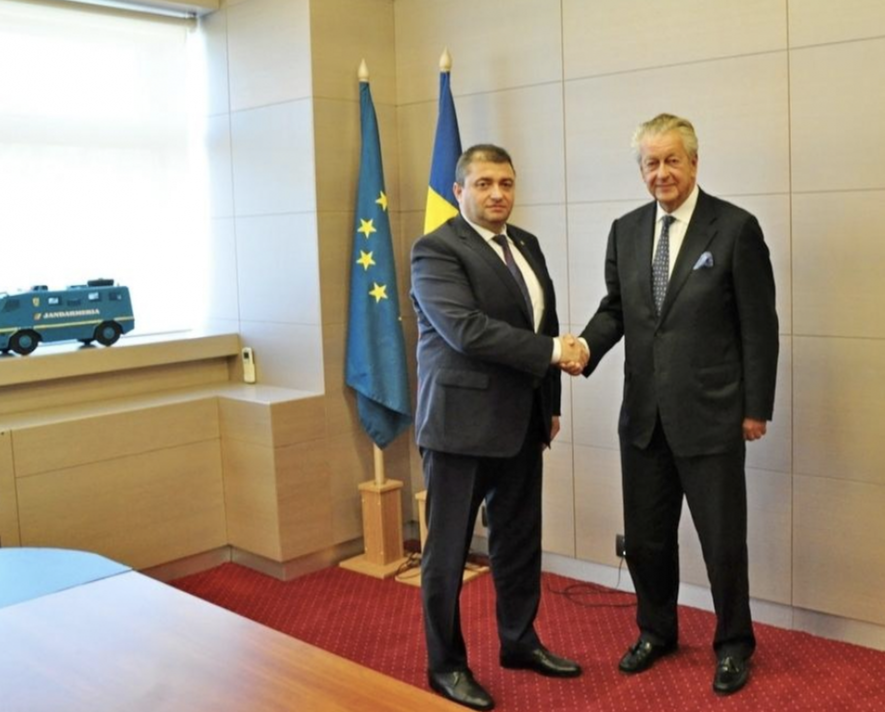 Lobby-ul americano-olandez a început imediat să funcționeze: iată-l pe patronul olandez Kommer Damen pentru o întrevedere cu ministrul român al Economiei, Dănuț Andrușcă, discuţiile având ca subiect principal viitorul Șantierului Naval Damen Mangalia.