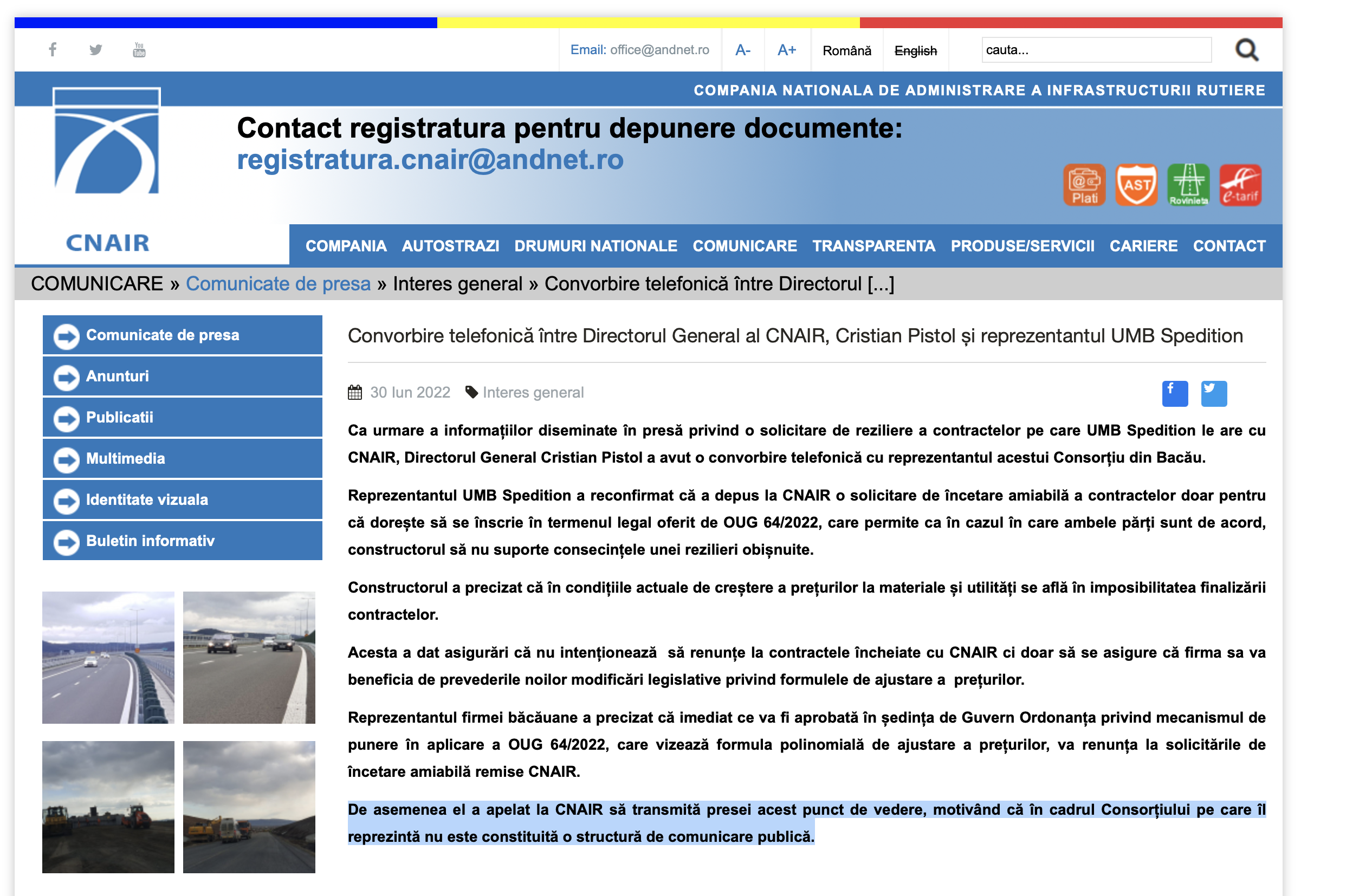 Și mai trist e finalul "comunicatului" CNAIR în care ditamai instituția se comportă ca un purtător de cuvânt pentru super milionarul bacauan: