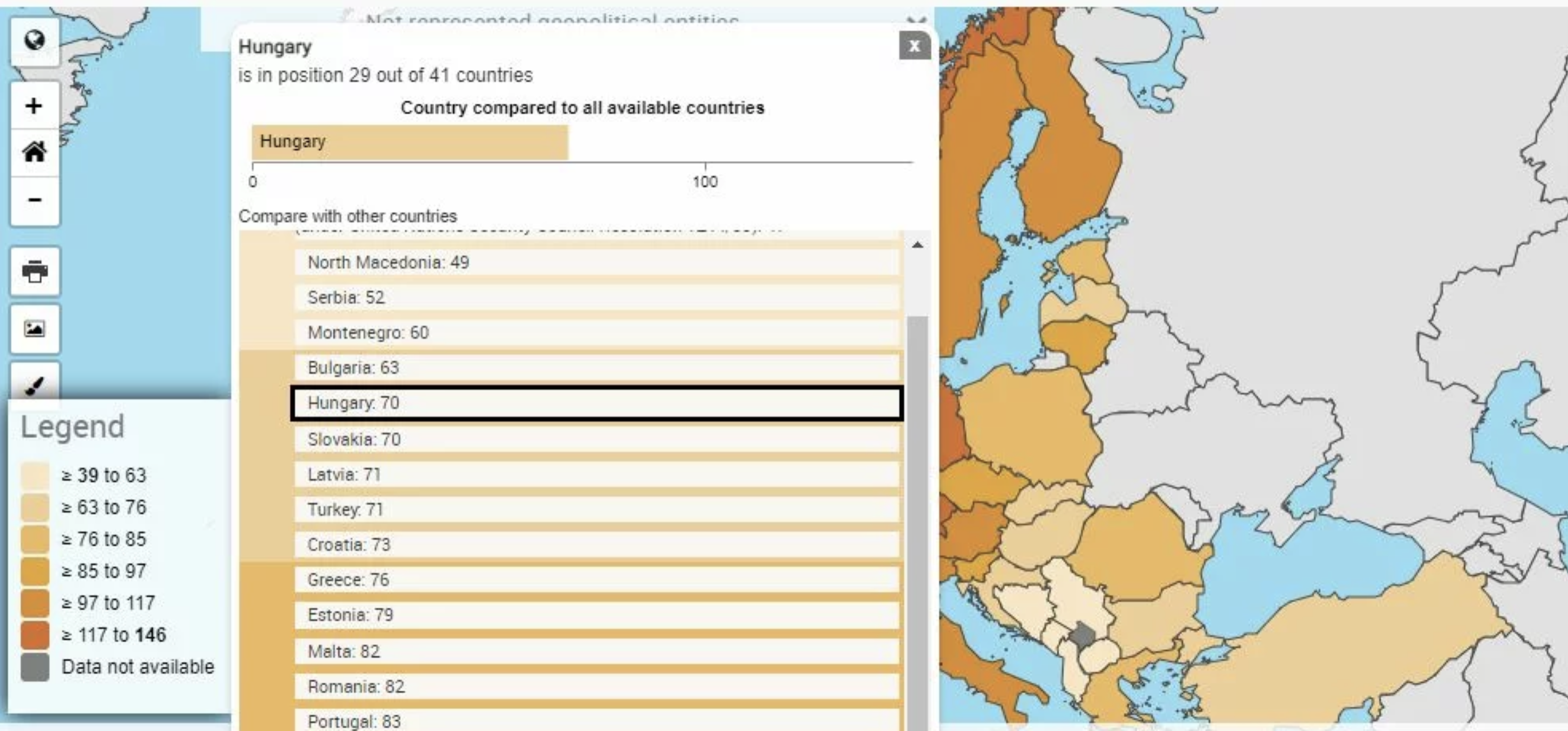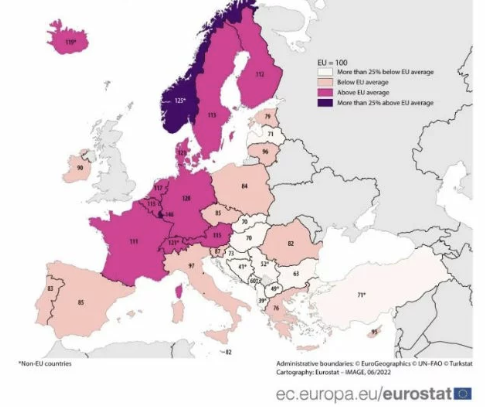 Conform hărții de mai sus, Ungaria aparține acelor țări UE care au un scor cu peste 25 la sută sub media UE. Cu toate acestea, trebuie menționat că statisticile nu arată cum variază consumul individual în țară. În unele cazuri, elita poate produce un număr mare, în timp ce, în realitate, săracii nu au hrană. De asemenea, este posibil ca unele țări să prospere doar din cauza împrumuturilor. În plus, oamenii ar putea să-și investească veniturile, pe care nici statisticile nu le iau în considerare.